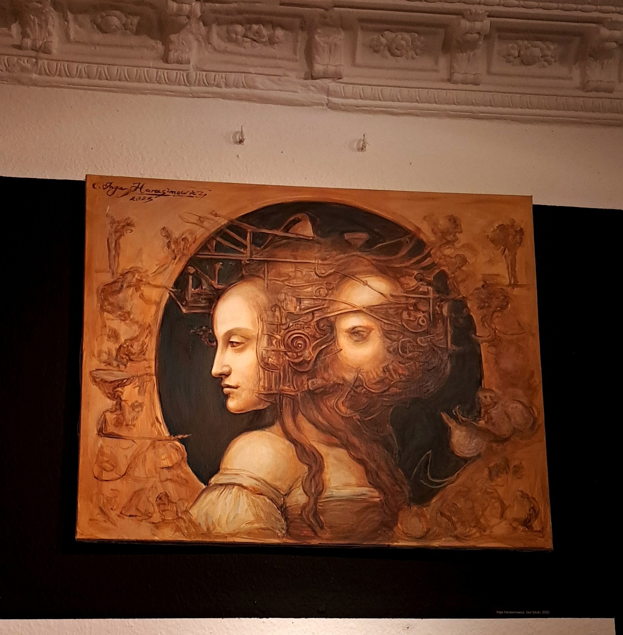 Inga Harasimowicz's painting "AI 1" mixed technique, canvas 90cm x 75cm, exhibition at the Wspólna Gallery in Bydgoszcz, dedicated to Artificial Intelligence.