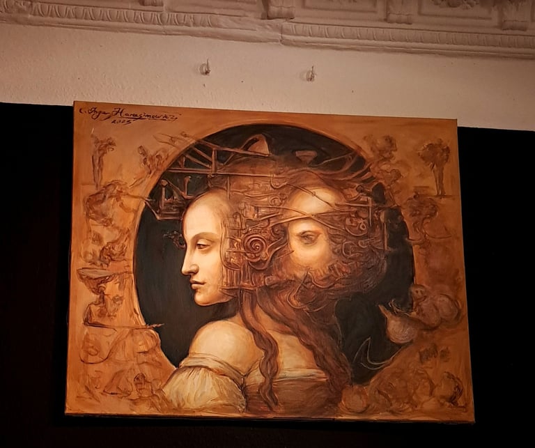 We seek knowledge and we seek truth, already accustomed to technical conveniences, as Al becomes our third hand. However, until Al is immersed in the Cultural Model for a given natural language, the answers it provides will be riddled with many errors and hallucinations-chimeras and imps of AI. Al language models are based on various data sources, often containing a false image of reality. The classical face of a Renaissance woman on the left is intertwined with her entanglement on the right. The woman's head is somewhat observing itself. The choice of colors aids in the serene contemplation of the painting with a blue-green background and golden browns. The technical solutions between the gazes evoke Leonardo's drawings, technicalities from the distant past--no fiber optics or other fireworks of modern technology here; we see tangled hair and metaphorical ears resembling violin handles.